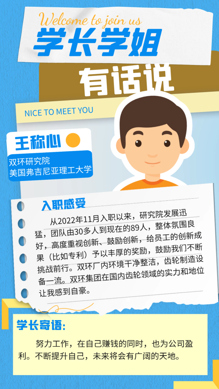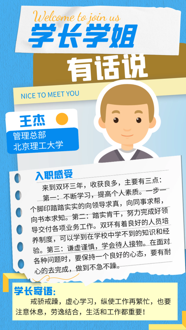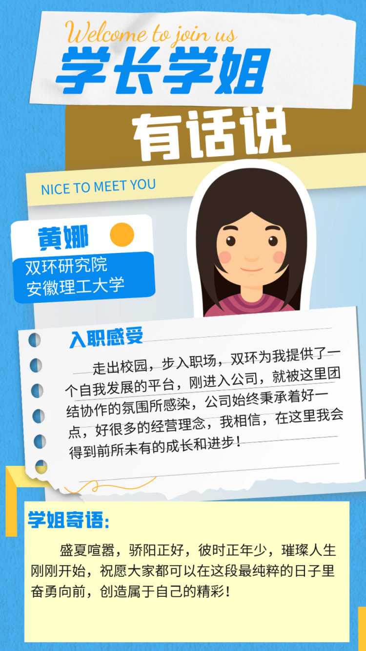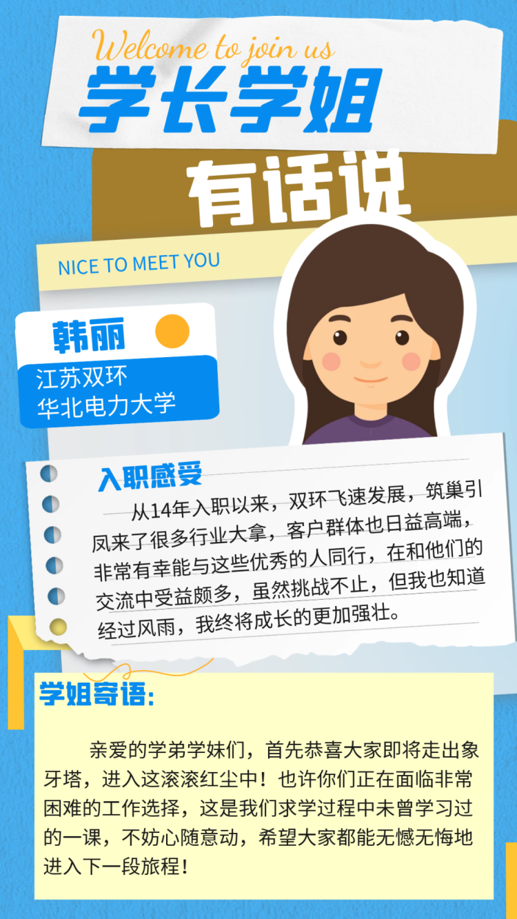 對(duì)于正在擇業(yè)的學(xué)弟學(xué)妹們,雙環(huán)的學(xué)長(zhǎng)學(xué)姐給出了自己入職雙環(huán)的一些切實(shí)感受和真誠(chéng)寄語(yǔ),正在觀望的你不妨看看學(xué)長(zhǎng)學(xué)姐們的精彩分享吧。