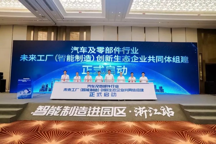 大會在汽車及零部件行業(yè)未來工廠(智能制造)創(chuàng)新生態(tài)企業(yè)共同體組建啟動儀式中進入高潮,李水土與參會領(lǐng)導一起啟動了這一神圣時刻。