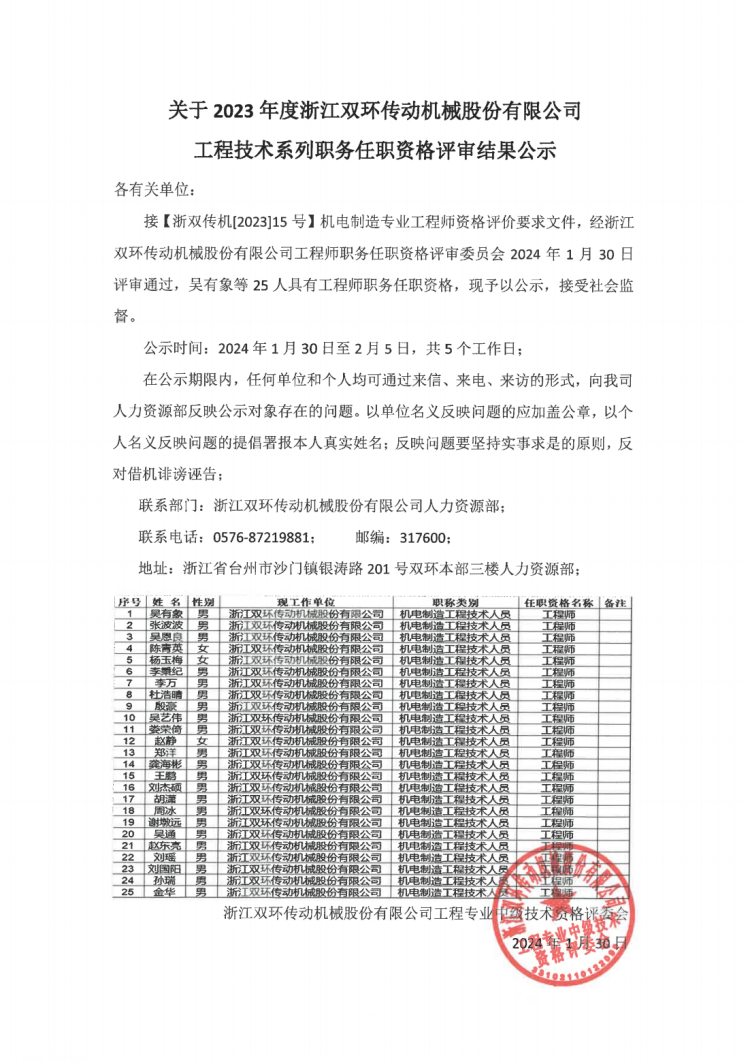關(guān)于2023年度浙江雙環(huán)傳動機械股份有限公司工程技術(shù)系列職務(wù)任職資格評審結(jié)果公示