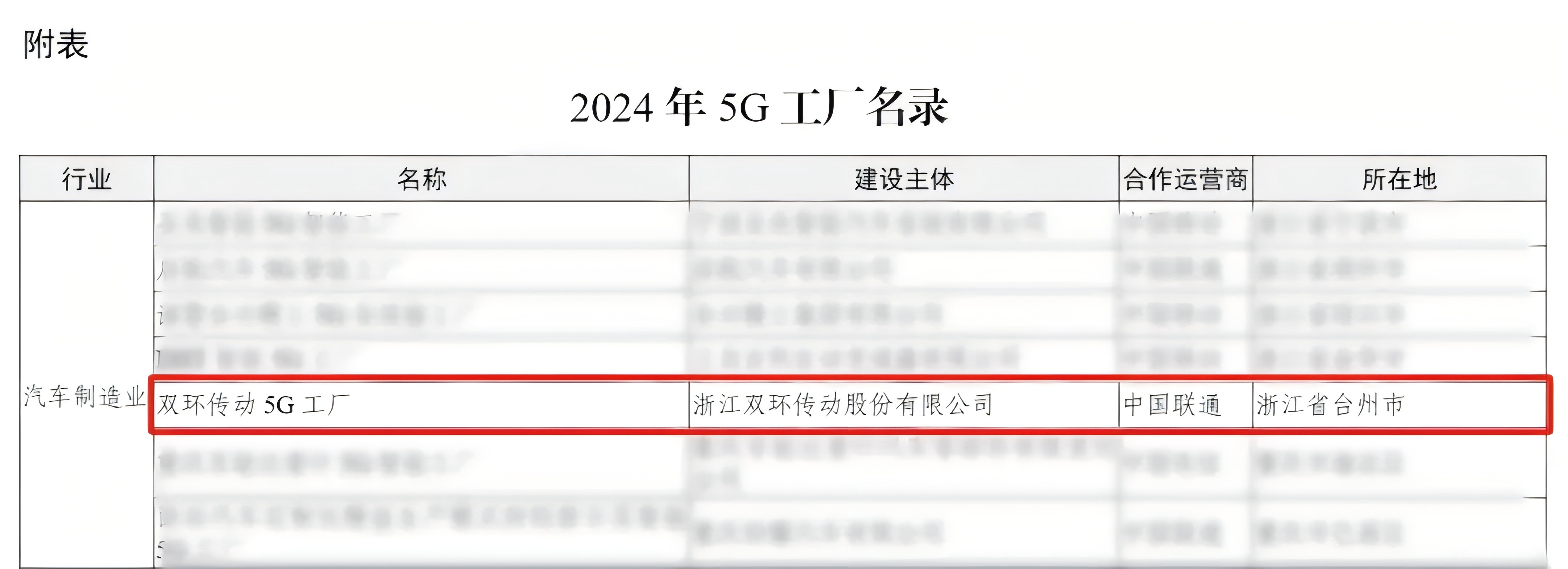 近日,工業(yè)和信息化部正式公示了《2024年5G工廠名錄》,“雙環(huán)傳動(dòng)5G工廠”成功入選。這是對(duì)雙環(huán)傳動(dòng)在智能制造和數(shù)字化轉(zhuǎn)型上取得成績(jī)的充分肯定。