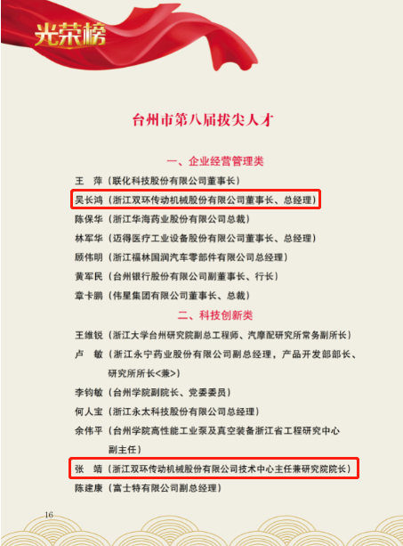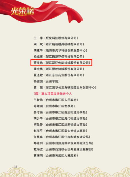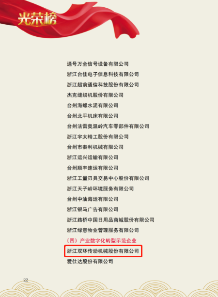 其中,我司榮獲“科技創(chuàng)新先進(jìn)企業(yè)產(chǎn)業(yè)”和“數(shù)字化轉(zhuǎn)型示范企業(yè)”兩項(xiàng)稱號,公司董事長吳長鴻先生榮獲臺州市企業(yè)經(jīng)營管理類第八屆拔尖人才獎項(xiàng),監(jiān)事會主席董美珠女士榮獲招才引智先進(jìn)個人獎項(xiàng),機(jī)械研究院院長張靖先生榮獲臺州市科技創(chuàng)新類第八屆拔尖人才獎項(xiàng)。